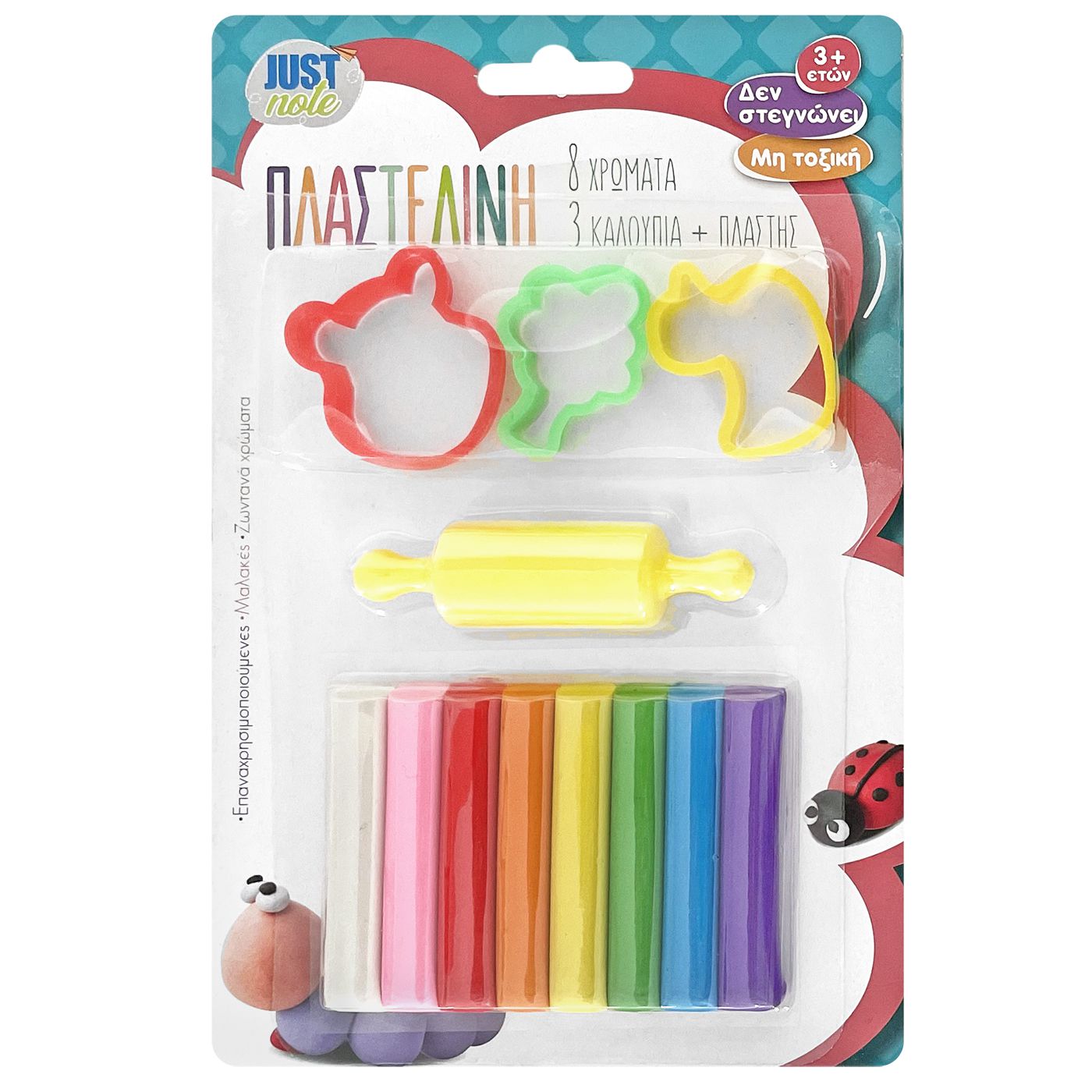Πλαστελίνη με 3 Καλούπια & Πλάστη σετ=8 Χρώματα 100gr net JustNote 703439